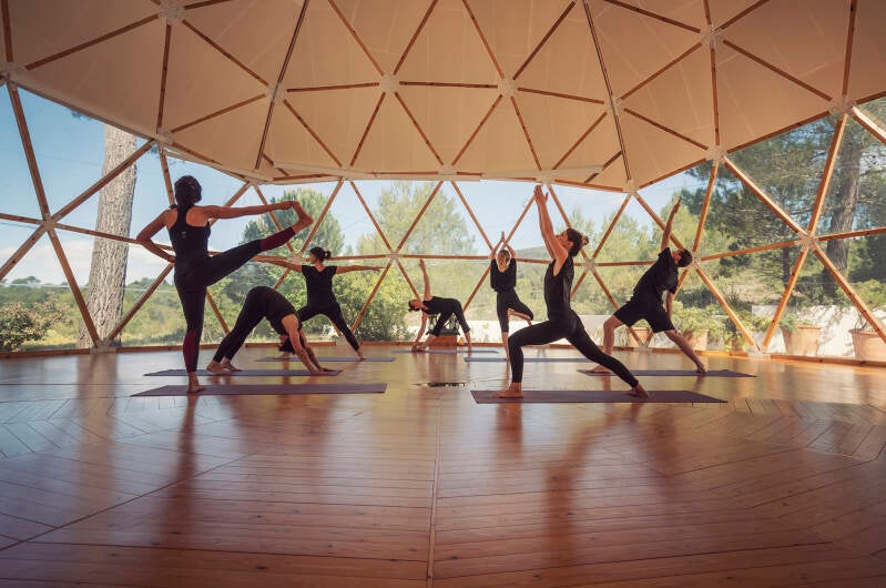 De yoga- en meditatiesessies worden gehouden in een spectaculaire koepelvormige ruimte bij het zwembad, rondom uitkijkend op het groen.
